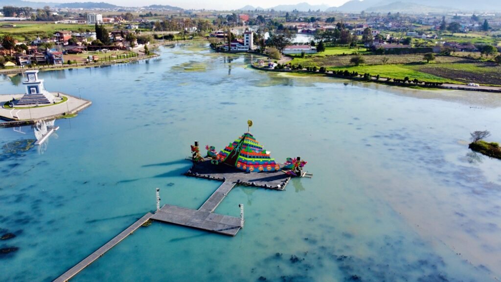 Se coloca una #pirámide sobre una estructura que está sobre el agua de la laguna lo que es espectacular a la vista de los visitantes que pueden ver el reflejo de las luces neón durante la presentación del Festival que se hace durante la noche.