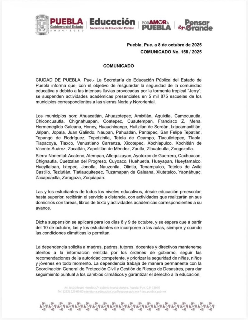 La Secretaría de Educación Pública (SEP) de Puebla informó la suspensión temporal de clases presenciales en 875 escuelas ubicadas en la Sierra Norte y Sierra Nororiental del estado, debido a las intensas lluvias ocasionadas por la tormenta tropical “Jerry”.