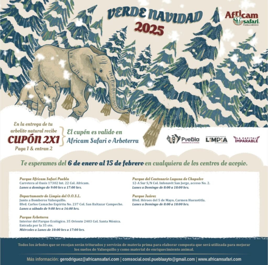 El Gobierno de la ciudad, encabezado por el presidente municipal Pepe Chedraui, en coordinación con Africam Safari, dio inicio a la Campaña Verde Navidad 2025, una estrategia ambiental implementada a través del Organismo Operador del Servicio de Limpia (OOSL) para promover el reciclaje adecuado de árboles naturales de Navidad y fortalecer la protección del medio ambiente en el municipio.